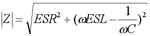 隨著電路系統(tǒng)時鐘頻率的增加,很多情況就不能按照理想的電容器來考慮了。一個實際的電容不論是陶瓷電容還是電解電容,都可以被簡化成一個串聯(lián)RLC的模型。一個電容模型包括自身的電容C,還包括了等效的串聯(lián)電感ESL和等效串聯(lián)電阻ESR這兩個重要的參數(shù)。這個串聯(lián)模型的阻抗幅值是: