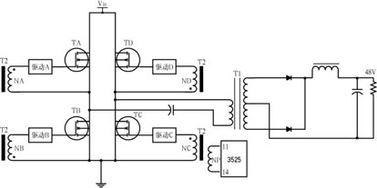 實(shí)際電路都是由非理想元件組成的,在設(shè)計(jì)中可能會(huì)遇到許多預(yù)料不到的情況。在調(diào)試如圖1所示的普通全橋電源時(shí),輸出不是料想中平穩(wěn)的波形,而是不時(shí)發(fā)生間歇振蕩,并發(fā)出“吱吱”聲,有時(shí)甚至?xí)龤ч_關(guān)管。對電路進(jìn)行分析后未發(fā)現(xiàn)結(jié)構(gòu)上可能導(dǎo)致不穩(wěn)定的因素,于是改變輸出采樣的電壓比,將輸出調(diào)定在半電壓24V上,使用90V的輸入直流電壓,在保證功率管安全的情況下進(jìn)行調(diào)試。待電路工作正常后,再緩慢升高輸入直流電壓,經(jīng)過多次試驗(yàn),發(fā)現(xiàn)當(dāng)Ui為180~250V時(shí)就可能引發(fā)振蕩,最后判定是驅(qū)動(dòng)變壓器各個(gè)繞組之間的分布電容在搗亂。