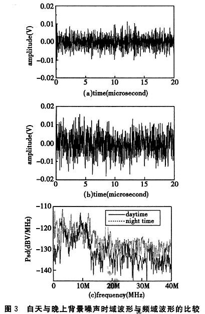 圖3(a)和(b)為在白天和晚上的噪聲時域采樣波形,(c)為白天、晚上噪聲PSD的比較。晚上的有色背景噪聲和窄帶干擾PSD比白天高出約5~15dB。背景噪聲晚上較高的可能原因是晚上用電負載的增加。