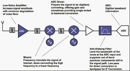 那么,什么樣的設(shè)計(jì)是一個(gè)較好的射頻系統(tǒng)設(shè)計(jì)呢?首先,信號靈敏度要高,這意味著較低的噪聲,時(shí)鐘引入的相位噪聲同樣要低。輸入信號要有足夠的驅(qū)動(dòng)能力,相關(guān)的指標(biāo),如高的三階截點(diǎn)和1dB壓縮點(diǎn)。然后就是各個(gè)模塊的性能是否足夠好,是否能較好的區(qū)分信號和噪聲,線性度是否足夠好等等。另外呢就是低功耗低成本等方面的考慮了。