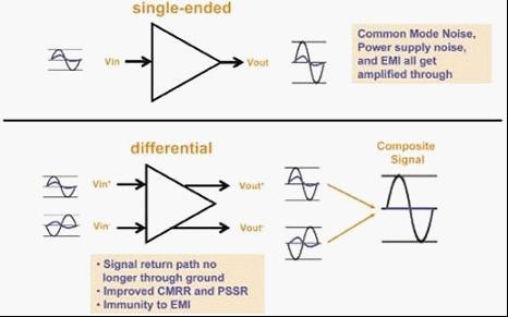 如圖2所示,單端信號會(huì)對共模噪聲、電源噪聲和電磁干擾比較敏感,運(yùn)放會(huì)對這些噪聲一定程度的放大。而差分信號由于兩側(cè)信號自身形成電流回路,抑制了共模噪聲和干擾,僅對差模信號進(jìn)行有效放大。