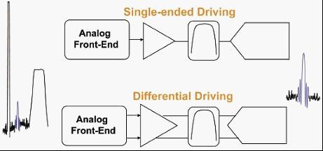 我們說差分信號鏈相對單端信號來講有很多優(yōu)勢。由于是差模信號,輸出的是兩個(gè)差分信號,實(shí)際上輸出的差模信號幅度相對擴(kuò)大了一倍,換一個(gè)角度來講,在同等輸出范圍條件下,工作電壓會(huì)更低。這樣,在要求低諧波失真的應(yīng)用中,就可以保證足夠的幅值余量。差分系統(tǒng)自身類似奇函數(shù)的特性可以消除系統(tǒng)中的偶次諧波項(xiàng),也就是說2次、4次、6次諧波等,在這些頻點(diǎn)上的諧波相對奇次諧波會(huì)很小甚至看不到。最后,由于信號的返回路徑不再是地平面,信號受地平面或是電源平面影響不是那么敏感,從而減少了噪聲的耦合引入,同時(shí)實(shí)現(xiàn)更好的抗電磁干擾效果。