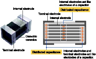 手機高頻電路系統的電感應具有高Q值和小尺寸。然而遺憾的是,如果將線圈變小達到更微小體積,則造成直流電阻的增加,導致低Q值。另外,更高的頻率范圍的內部電極和其它零件的分布寄生電容(未出現在電路圖中的電容)對Q值的影響很大。線圈感抗(X)與線圈電感和頻率成正比,采用方程式X=2πfL來定義。理想的電感是指電感值為常數時,感抗和頻率成正比。因此,頻率和電抗對比的繪制圖應成一條直線,然而在實際中,更高頻率位置電抗下降,而線圈的分布電容正是造成這一現象的原因。在積層電感中,繞線圖案的作用類似電容電極,會產生分布電容(圖表二)。同樣,分布電容也存在于端子電極和繞線圖氨之間。