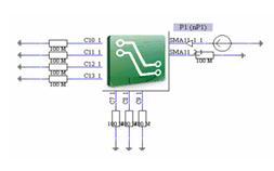 用CST印制板工作室對(duì)該P(yáng)CB生成網(wǎng)格后,建立如圖9所示的電路以仿真裸板情況下的輸入阻抗特性。該電路中在原本加電容的位置用100MΩ代替以模擬開(kāi)路情況下的阻抗。
