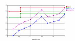 對(duì)于電子產(chǎn)品的電磁輻射,國(guó)際電工委(IEC:InternationalElectrotechnicalCommission)制定了強(qiáng)制標(biāo)準(zhǔn)。通常,印制板都只是系統(tǒng)中的一部分,在進(jìn)行電磁輻射分析的時(shí)候除了要考慮印制板本身的輻射問(wèn)題外,還需要考慮系統(tǒng)中其它設(shè)備對(duì)對(duì)電磁輻射的影響,尤其是帶有通風(fēng)孔機(jī)箱的屏蔽效能。CST印制板工作室在進(jìn)行SI仿真的同時(shí),可以得到印制板上電流分布的幅度和相位信息,并通過(guò)與CST微波工作室的協(xié)同將該電流分布作為激勵(lì)源,然后再加上機(jī)箱,充分考慮孔、縫對(duì)電磁輻射的影響。仿真的結(jié)果自動(dòng)與內(nèi)嵌的EMC國(guó)際標(biāo)準(zhǔn)限值進(jìn)行對(duì)比,如圖16所示。