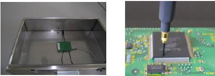 表面掃描法通過測(cè)量集成電路表面電場(chǎng)和磁場(chǎng)的方法來描述集成電路的電磁發(fā)射特性。該方法的測(cè)量頻率范圍可達(dá)10MHz—3GHz,測(cè)量采用電場(chǎng)探頭或磁場(chǎng)探頭按一定順序掃過集成電路表面,由接收機(jī)將相應(yīng)的測(cè)量結(jié)果依次傳送給計(jì)算機(jī)處理。測(cè)試結(jié)果的準(zhǔn)確性與電場(chǎng)或磁場(chǎng)探頭的特性和探頭定位裝置的精度有關(guān)。該方法可用于探測(cè)集成電路芯片上不同部位的電磁發(fā)射分布情況,適用于對(duì)集成電路的不同設(shè)計(jì)方案的電磁發(fā)射特性的比較。