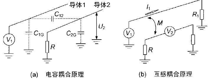 當一根導線上存在電壓或有電流流過時, 就會有電磁能量輻射出來, 到達附近的導線上, 這就是導線之間的串擾。串擾屬于近場的感應耦合, 原因是導線之間存在雜散電容和互感, 即電容耦合和互感耦合, 如圖1 所示。
