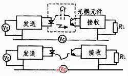 用光傳輸信號是解決地環路問題的理想方法。如圖3所示,光耦器件的寄生電容為2 pF左右,因此能夠在很高的頻率起到隔離作用。如果使用光纖,則沒有寄生電容的問題,能夠獲得十分完善的隔離效果。但是,用光纖會帶來其它問題,如:需要更大的功率、需要更多的外圍器件,光連接的線形和動態范圍都達不到模擬信號的要求、光纜的安裝和維護比較復雜等,使用時應注意。
