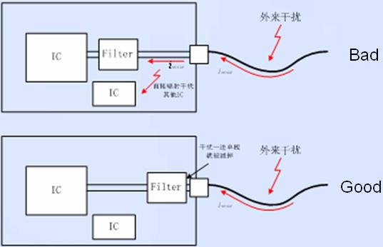 對于時鐘線、總線、射頻線等強輻射信號線和復位信號線、片選信號線、系統控制信號等敏感信號線,應遠離接口外出信號線。從而避免強輻射信號線上的干擾耦合到外出信號線上,向外輻射;也避免接口外出信號線帶進來的外來干擾耦合到敏感信號線上,導致系統誤操作。