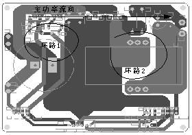 對于元器件的放置,由于開關電源的輻射干擾(E)與電流通路中電流(I)的大小,通路的環路面積(A),以及電流頻率(f)的平方等三者的乘積成正比,即E=I·A·f2。運用這一關系的前提是通路尺寸遠小于頻率的波長(此電路符合條件)。