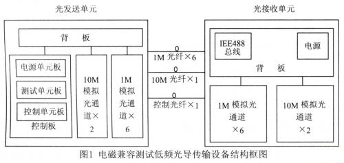 EMC測試低頻光導(dǎo)傳輸設(shè)備由光發(fā)送單元和光接收單元組成。光發(fā)送單元由背板、控制板(包括電源單元、測試信號發(fā)生器單元及控制電路單元)、1OMHz通道發(fā)送板(2通道)以及1MHz通道發(fā)送板(6通道)組成;光接收單元由背板(包括電源單元、IEEE488接口單元)、10MHz通道接收板(2通道)以及1MHz通道接收板(6通道)組成。如圖1所示。