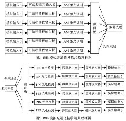 EMC測試低頻光導(dǎo)傳輸設(shè)備1MHz模擬光通道包含6個低頻模擬信號光傳輸通道,6個低頻傳輸通道的信號頻帶為100Hz~1MHz,采用1550nm單縱模DFB激光器和AM直接強度調(diào)制技術(shù),通過6芯單模光纖傳輸,原理框圖如圖2、圖3所示。