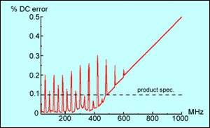 大多數(shù)模擬設(shè)備的抗擾度問題是由射頻解調(diào)引起的。運(yùn)放每個(gè)管腳都對(duì)射頻干擾十分敏感,這與所使用的反饋線路無(wú)關(guān)(見圖3),所有半導(dǎo)體對(duì)射頻都有解調(diào)作用,但在模擬電路上的問題更嚴(yán)重。即使低速運(yùn)放也能解調(diào)移動(dòng)電話頻率及其以上頻率的信號(hào),圖4表明了實(shí)際產(chǎn)品的測(cè)試結(jié)果。