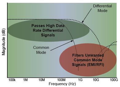 第二類EMI濾波器適用于高速串行接口,功能超過了典型低通濾波器。這類接口是具有固有噪聲抑制的差分信號路徑,但不會完全免疫來自外部源的共模噪聲,或阻止來自輻射到系統其他部分的接口信號。