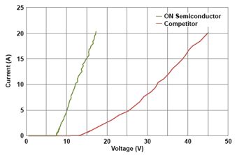 安森美半導體的ESD鉗位性能備受業界推崇,鉗位性能可從幾種方法觀察和量化。使用幾個標準工具即可測量獨立ESD保護器件或集成器件的ESD鉗位能力,包括ESD保護功能。第一個工具是ESD IEC61000-4-2 ESD脈沖響應截圖,顯示的是隨時間推移的鉗位電壓響應,可以看出ESD事件中下游器件的情形。