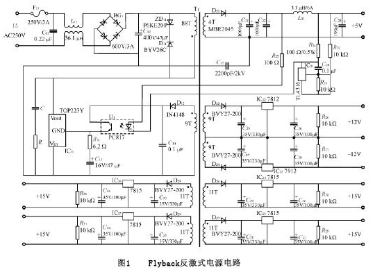 輸入為交流220V,經功率二極管整流橋變為直流作為反激變換器的輸入,輸出為三組直流:+5V,15V,12V,另外有一輔助電源5V,用來給光耦PC817供電??刂齐娐酚梅答伩刂疲x用TOPSwicth系列的TOP223Y芯片。
