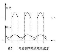 本電路中,交流輸入電壓Ui經功率二極管整流橋變為正弦脈動電壓,經電容C12平滑后變為直流,但電容電流的波形不是正弦波而是脈沖波。如圖2所示?! ?br />