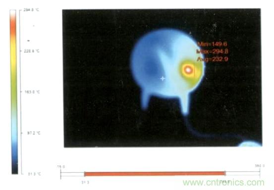 這種壓敏電阻通過擊穿點(diǎn)進(jìn)行電流泄放,在泄流點(diǎn)會(huì)形成大量的熱量,這種熱量最終會(huì)導(dǎo)致壓敏電阻燒穿(見下圖)。