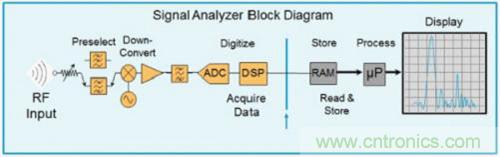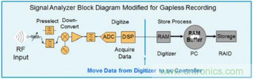 在對系統(tǒng)干擾進行特征分析時,系統(tǒng)工程師通常依賴信號分析儀來完成長時間的連續(xù)錄存,如圖1所示。長時間錄存的主要局限是,測試設(shè)備中板子的內(nèi)存容量不夠大。目標(biāo)信號首先進入分析儀的RF輸入,隨后被處理,產(chǎn)生圖1右側(cè)所顯示的波形。假設(shè)系統(tǒng)使用了一個固定本機振蕩器,該儀器捕獲帶寬內(nèi)的所有目標(biāo)信號在到達(dá)藍(lán)色豎線之前,都會經(jīng)過實時處理。一旦采樣信號進入緩存或RAM中,該儀器便不再關(guān)注新進入的數(shù)字樣本。相反,它必須處理先前錄存的采樣數(shù)據(jù)。