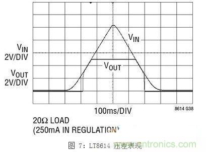 該器件的超低壓差電壓僅受到內部頂端開關的限制。與其他解決方案不同,LT8614的RDSON不受最大占空比和最短斷開時間限制。該器件在出現壓差時跳過開關斷開周期,僅執(zhí)行所需的最短斷開周期,以保持內部頂端開關升壓級電壓持續(xù)提供,如圖6所示。[page]