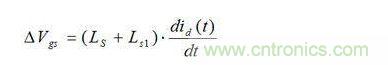在諧振條件(ωL=1/ωC)下,柵極和源極電壓中生成的震蕩電壓遠大于驅(qū)動電壓。因諧振變化而產(chǎn)生的電壓振蕩與品質(zhì)因數(shù)成正比,Q(=ωL/R=1/ωCR)。當MOSFET關(guān)閉時,漏極寄生電感(LD+Ld1)、柵極-漏極電容Cgd和柵極引線電感Lg1網(wǎng)絡造成柵極振蕩電壓。如果柵極電阻(RG-ext.+Rg_int.)極小,則Q變大。另外,LS兩端的壓降和Ls1源極雜散電感在柵極-源極電壓中產(chǎn)生振蕩,可用表達式(1)表示。寄生振蕩可能造成柵源極擊穿、不良EMI、較大開關(guān)損耗、柵極控制失效,甚至可能造成MOSFET故障。