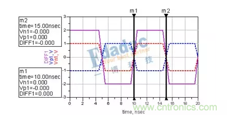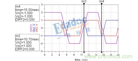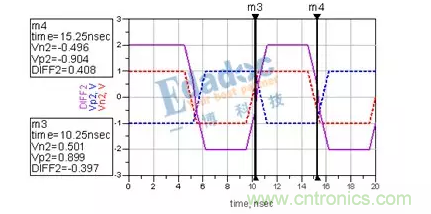 可以看到,兩次經過零軸的時間由之前的5ns變成了4.8ns。或者說,N與P的長度差,引起了0.04UI的抖動。這時候,串行的Clock recovery該花點心思才能將其時鐘解出來了。而且在進行時鐘與數據對位的時候,是對在0V這個階梯的左邊還是對在右邊呢?這又會引起時序問題的出現。