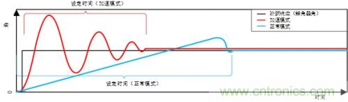 當旋轉變壓器的電機位置或輸出信號變化迅速時,穩定時間是RDC控制系統的快速性能指標[2]。圖1顯示的一個是有階躍輸入變化(黑線)的RDC反饋控制系統的穩定時間的例子。藍色信號顯示的是對電路的正常模式響應,紅色信號顯示的是加速模式過程中響應(角快速變化)。為了在快速變化的條件下追蹤到旋轉角,加速模式幫助控制回路很容易跟蹤到一個快速的旋轉角[4]。