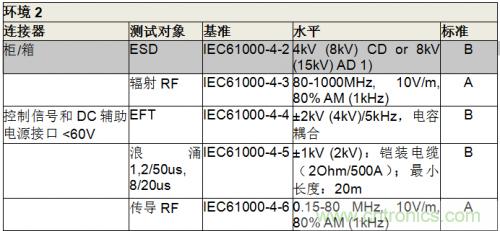 TI工程師測試IEC61800-3標準來獲取環境規范(表1)。該設計使用鎧裝連接器和鎧裝電纜(長度>30m)。標準的定義見表2。