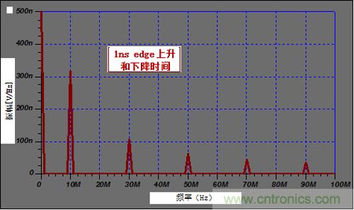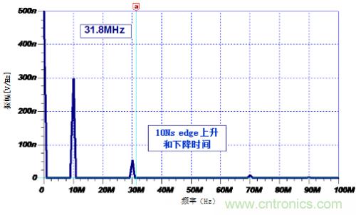 根據該公式,10nsEdge Rate對應的諧波頻率大約為31.8MHz。圖3顯示:最后一個重要的諧波頻率為30MHZ。同時,1ns的Edge Rate對應的諧波頻率318MHZ(圖2)。如果頻率范圍擴展到300MHZ以外,顯示的諧波仍很明顯,但卻在相關頻率上迅速變小。