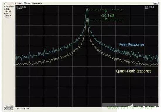 這里需要著重指出的是,對某些頻率范圍,CISPR測試要求提倡使用準峰值(QP)這種檢測器類型,這將掩蓋實際頻率。通常EMI部門或外部實驗室一開始 是使用簡單的峰值檢測器執行掃描來發現問題區域的。但當所發現的信號超過或接近規定極限時,他們也執行準峰值測量。準峰值是EMI測量標準定義的一種方法,用來檢測信號包絡的加權峰值。它根據信號的持續時間和重復率對信號進行加權,以便對從廣播角度看解釋為“騷擾”的信號施加更多的權重。與不頻發的脈沖相比,發生頻率更高的信號將導致更高的準峰值測量結果。換句話說,問題信號發生的越頻繁,問題信號的絕對幅度就越可能被準峰值測量所屏蔽。