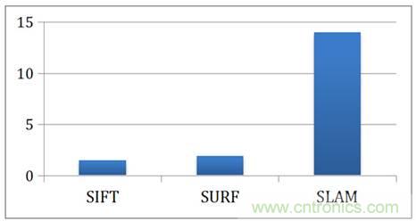 為了讓讀者了解FPGA對特征提取與位置追蹤的加速以及節能,下面我們關注加州大學洛杉磯分校的一個關于在FPGA上加速特征提取與SLAM算法的研究。圖5展示了FPGA相對CPU在執行SIFT feature-matching、SURF feature-matching以及SLAM算法的加速比。使用FPGA后,SIFT與SURF的feature-matching分別取得了30倍與9倍的加速,而SLAM的算法也取得了15倍的加速比。假設照片以30FPS的速度進入計算器,那么感知與定位的算法需要在33毫秒內完成對一張圖片的處理,也就是說在33毫秒內做完一次特征提取與SLAM計算,這對CPU會造成很大的壓力。用了FPGA以后,整個處理流程提速了10倍以上,讓高幀率的數據處理變得可能。
