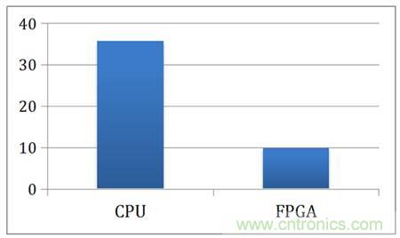 為了讓讀者對FPGA加速有更好的了解,我們總結了微軟研究院2010年對BLAS算法的FPGA加速研究。BLAS是矩陣運算的底層庫,被廣泛運用到高性能計算、機器學習等領域。在這個研究中,微軟的研究人員分析了CPU、GPU以及FPGA對BLAS的加速以及能耗。圖2對比了FPGA以及CPU、GPU執行GaxPy算法每次迭代的時間,相對于CPU,GPU與FPGA都達到了60%的加速。圖中顯示的是小矩陣運算,隨著矩陣的增大,GPU與FPGA相對與CPU的加速比會越來越明顯。