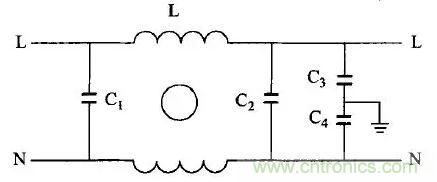 交流電源輸人線上存在以上兩種干擾,通常為低頻段差模干擾和高頻段共模干擾。在一般情況下差模干擾幅度小、頻率低、造成的干擾小;共模干擾幅度大、頻率高, 還可以通過導線產生輻射,造成的干擾較大。若在交流電源輸人端采用適當的EMI濾波器,則可有效地抑制電磁干擾。電源線EMI濾波器基本原理如圖1所示, 其中差模電容C1、C2用來短路差模干擾電流,而中間連線接地電容C3、C4則用來短路共模干擾電流。共模扼流圈是由兩股等粗并且按同方向繞制在一個磁芯 上的線圈組成。如果兩個線圈之間的磁藕合非常緊密,那么漏感就會很小,在電源線頻率范圍內差模電抗將會變得很小;當負載電流流過共模扼流圈時,串聯在相線上的線圈所產生的磁力線和串聯在中線上線圈所產生的磁力線方向相反,它們在磁芯中相互抵消。 因此即使在大負載電流的情況下,磁芯也不會飽和。而對于共模干擾電流,兩個線圈產生的磁場是同方向的,會呈現較大電感,從而起到衰減共模干擾信號的作用。 這里共模扼流圈要采用導磁率高、頻率特性較佳的鐵氧體磁性材料。