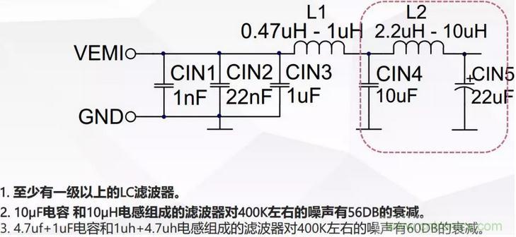 所有的LC濾波器都是以電感結(jié)束,并且要遠離DCDC的高頻環(huán)路。防止電流環(huán)路的近場磁場效應對輸入濾波器的影響。