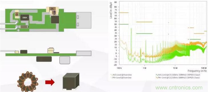 環(huán)形電感的漏磁較大,體積也比較大,對大地也有比較大的耦合電容,因此其對外的輻射更大,如圖8所示將環(huán)形電感替換為貼片電感后整體的EMI就會下降很多。
