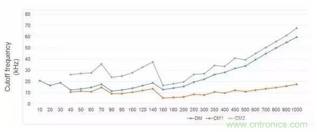 這張圖給出了不同頻率下共模和差模濾波器轉折頻率的關系,可以看出,一些低頻點EMI濾波器體現出了非常好的特性。例如70Khz,140Khz。而這兩個開關頻率是工業界常用的兩個開關頻率,非常討巧,因為EMI噪聲測試是150KHz到30MHz。不過這個也與拓撲有關。