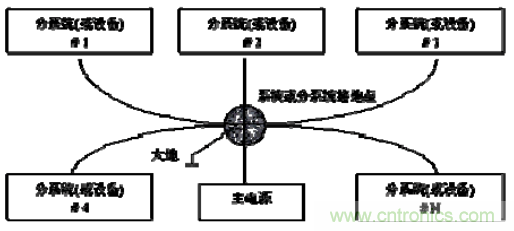 單點接地連接是指在產品的設計中,接地線路與單獨一個參考點相連,該點常常以地球為參考,如圖所示。