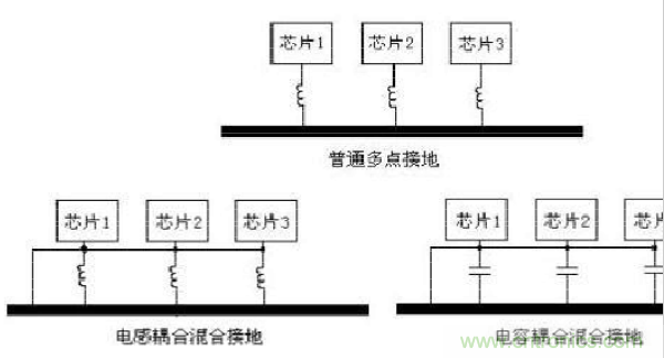 工作頻率高(>30MHz)的采用多點接地式(即在該電路系統中,用一塊接地平板代替電路中每部分各自的地回路),為了減小電感,要求地線的長度盡量短,在頻率很高的系統中,通常接地線要控制在幾毫米的范圍內。每根接地線的長度小于信號波長的1/20。