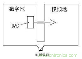 接地技術中還有一個很重要的部分就是數字電路與模擬電路的共地處理。一般說來,數字電路的頻率高,而模擬電路的對噪聲的敏感度強,正因為如此,高頻的數字信號線要盡可能遠離敏感的模擬電路器件,同樣,彼此的信號回路也要相互隔離,這就牽涉到模擬和數字地的劃分問題。一般的做法是,模擬地和數字地分離,只在某一點連接,這一點通常是在PCB板總的地線接口處,或者在數模轉換器的下方,必要時可以使用磁性元件(如磁珠)連接,如圖所示。