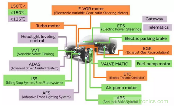 隨著汽車的輕量化、小型化,在引擎箱附近以及容易發熱的地方,越發需要能夠保證超過125℃的耐高溫元件。