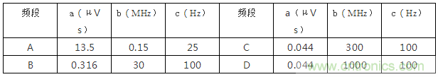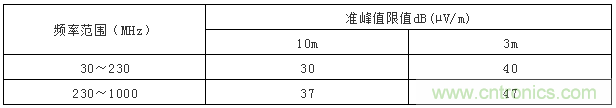 一般不同頻率段的限值是不一樣的,過(guò)渡頻率點(diǎn)應(yīng)該采取較低的限值,表1中230MHz的限值應(yīng)取較低值:30dB(µV/m)(10m法),40dB(µV/m)(3m法)。