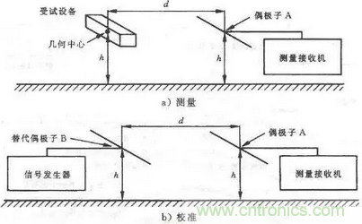 圖7所示為替代法測(cè)試的方法和布置。首先用半波振子天線A和測(cè)量接收機(jī)測(cè)量出EUT的最大騷擾值,然后用半波振子天線B替代EUT。調(diào)節(jié)信號(hào)發(fā)生器輸出功率,直至測(cè)量接收機(jī)達(dá)到同樣的值。記錄替代天線B的輸入端功率,即為EUT的殼體輻射功率。