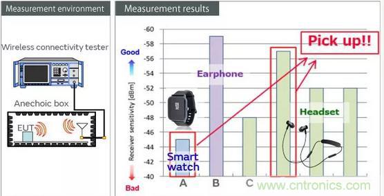 在許多內部耳機干擾的情況下,設備內的不需要的無線電波疊加在通信所需的信號之上,這會產生噪聲并導致音頻跳過。在這里,我們使用商業產品來測量2.4 GHz信號的最小接收電平,以驗證由于設計對策而導致音頻跳過的可能性的差異,以防止藍牙設備內的干擾。就內部設備干擾而言,大圖值表示即使信號較弱也可以進行通信,并且音頻不太可能跳過。