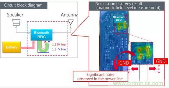 圖5顯示了用于測量的測量環境以及測量與藍牙天線耦合的噪聲的結果。觀察到極高水平的噪聲,這需要噪聲抑制以降低水平。實現藍牙噪聲抑制時,有兩個關鍵的實現區域。