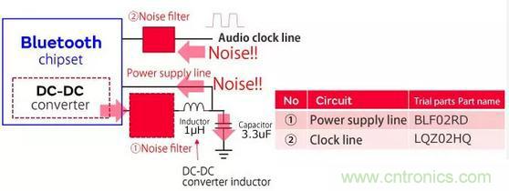 在這種情況下,我們引入了噪聲抑制的示例,其中同一電路中的噪聲干擾藍牙通信信號。該技術還可以應用于以2.4 GHz頻率通信的非藍牙設備,我們已經實現了噪聲抑制組件,這些組件在2.4 GHz的超小型x 0.4 mm x高頻范圍內非常有效考慮到在添加組件時需要節省安裝表面積,需要0.2 mm。