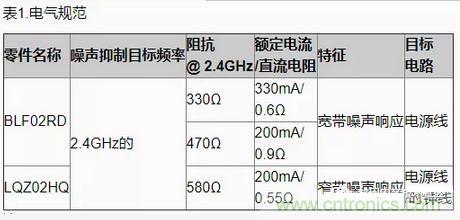 表1和圖6顯示了在這種情況下用于噪聲抑制的BLF02RD和LQZ02HQ濾波器的代表性電氣規范和插入損耗頻率特性。