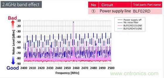 這些是在藍牙通信期間測量與天線耦合的噪聲頻譜的結果。將BLF02RD過濾器插入電源線。我們能夠將窄帶噪聲提高約5 dB,并驗證BLF02RD濾波器是一種有效的解決方案。