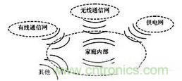 一些過去不具備聯網能力的電子設備,比如:電視、電冰箱、洗衣機、衛星機頂盒等家用設備和電器,成為家庭網絡的新成員,并接入網絡,使網絡配置更加復雜,設備間的電磁兼容性也變得更復雜(見圖1)。另外,家庭網絡將與現有通信網,供電網等共同形成新的電磁環境,不同網絡間的相互影響因素也更紛繁(見圖2)。