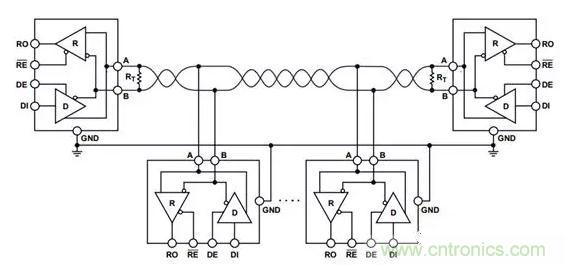 為了消除在通信電纜中的信號反射,一般使用雙絞線來避免干擾。對于比較長的連接,一般的做法是在RS-485總線的開始和末端都并接終端電阻,因為大多數雙絞線電纜特性阻抗大約在120Ω左右。