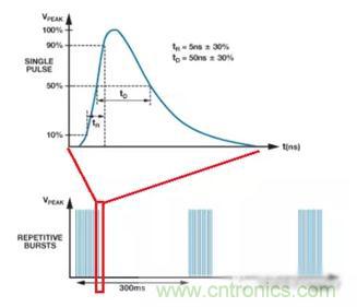 典型干擾波形:端口電壓2kV,單個EFT脈沖能量4mJ ,EFT 50Ω負載波形2kV